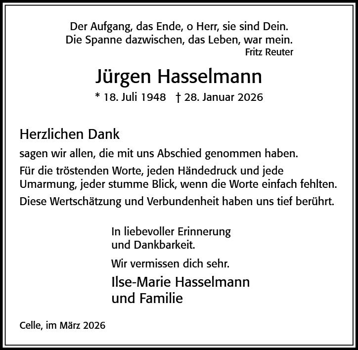 Liebe Familie Hasselmann ich wünsche Ihnen von ganzem Herzen Kraft und Stärke,um diesen unerwarteten Abschied von Jürgen zu bewältigen .